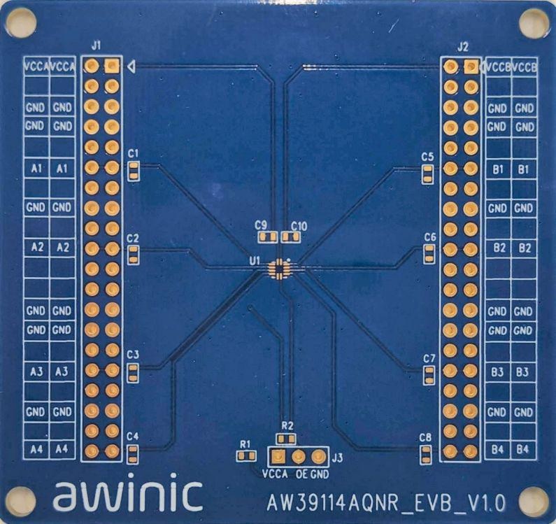AW39114A is a 4-bit high-performance voltage-level translator without direction control signal, which is a non-inverting converter and can be used to convert digital signal with mixed-voltage systems. It needs two separate power supply rails, with the A ports tracks the VCCA ranging from 1.1V to 3.6 V, and the B ports tracks the VCCB ranging from 1.65 V to 5.5 V. This makes the chip has capabilities of support both lower and higher logic signal levels translation between any of the 1.2V, 1.8 V, 2.5 V, 3.3 V, and 5 V voltage nodes.