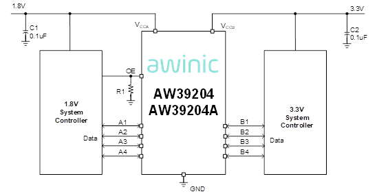 AW39204/AW39204A is a 4-bit non-inverting bidirectional voltage-level translator, it can be used to convert digital signal with mixed-voltage systems. It needs two separate power supply rails, with the A ports supporting operating voltages from 1.1 V to 5 V while it tracks the VCCA supply, and the B ports supporting operating voltages from 1.1 V to 5 V while it tracks the VCCB supply. This allows the support of both lower and higher logic signal levels while providing bidirectional translation capabilities between any of the 1.2 V,1.8 V, 2.5 V, 3.3 V, and 5 V voltage nodes.