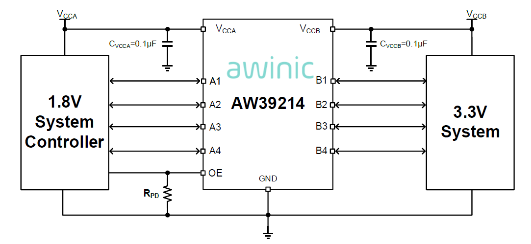 AW39214-Q1 is a 4-bit high-performance voltage-level translator without direction control signal, that enables bidirectional voltage level translation. It features two 4-bit input-output ports (An and Bn), one output enable input (OE) and two supply pins (VCCA and VCCB). VCCA can be supplied with any voltage between 1.2V and 3.6V. VCCB can be supplied with any voltage between 1.65V and 5.5V. The range of supply voltages makes the device suitable for translating between any of the low voltage nodes (1.2V, 1.5V, 1.8V, 2.5V, 3.3V and