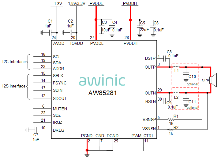 The AW85281 is a mono, digital input Class-D audio amplifier optimized for efficiently driving high peak power into loudspeakers. The Class-D amplifier is capable of delivering 30W of continuous power into a 4Ω load with less than 1% THD+N at a supply voltage of 18V. The broad voltage input range and the high output power makes this amplifier versatile enough to work with battery or line powered systems.