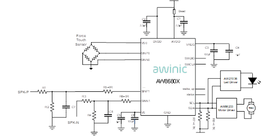 AW8680X is a SoC for smart home application,force application,notebook trackpad and so on, which is integrated ARM®CortexTM-M0+ core. It has embedded 60k byte program flash (APROM), 4k byte boot program space LDROM, 16k byte SRAM. It integrated timer, watch dog, 1 AFE module, 1 I²C module, 1 UART module and 1 GPIO module.