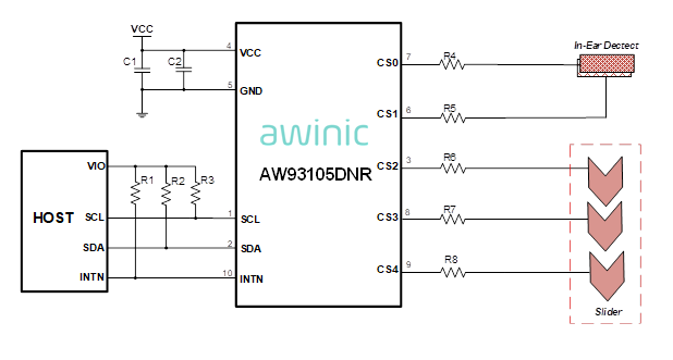 AW93105DNR is 5-channel low-power capacitive controller mainly used for in-ear detection and touch key detection in TWS headset. Each channel can be independently configured as sensor input, shield output.