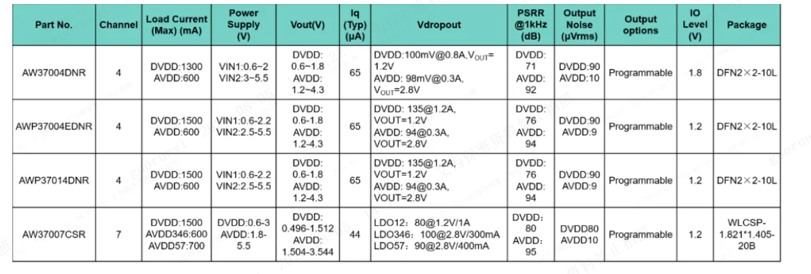 With the popularization of 64-megapixel and higher-spec cameras, their peak current demand has exceeded 1A. AW37012DXXXFOR, with a continuous output capability of 1.5A, can stably support high-pixel sensors in high-current scenarios such as high-speed continuous shooting and 4K video recording, ensuring the stability and integrity of image data collection.