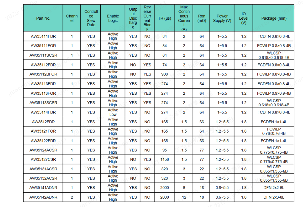 Awinic Load Switch Product Selection Table
