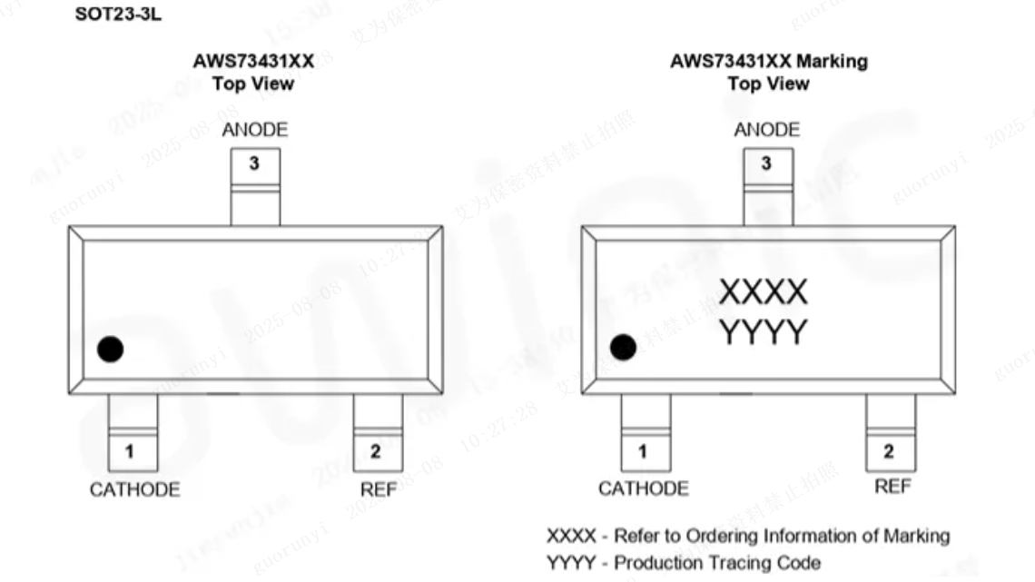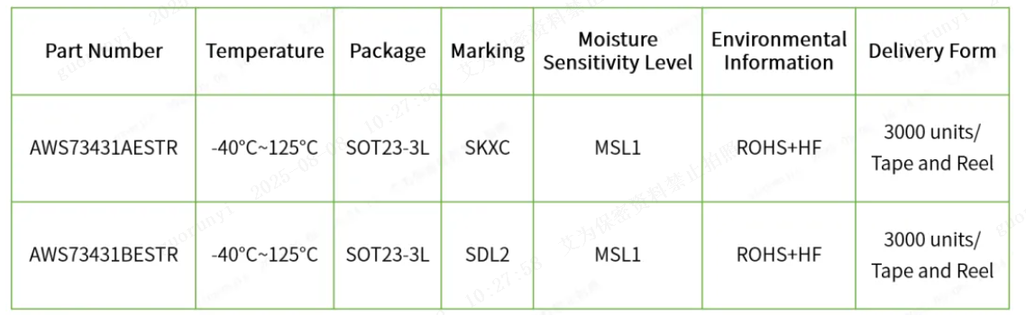 The AWS73431 adopts a miniaturized surface-mount package SOT23-3L, with a compact size and moderate pin spacing. It balances welding convenience and layout density, reducing PCB wiring crosstalk.