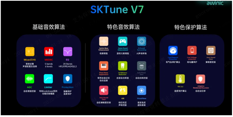 From Version 1 to Version 7, the "Divine Algorithm" awinic SKTune® has always been developed based on customer needs. With meticulous refinement and continuous breakthroughs in technical bottlenecks, it covers basic sound effect algorithms, advanced sound effect algorithms, hardware protection mechanisms, and specialized protection algorithms – bringing high-end auditory enjoyment to hundreds of millions of smartphone users.