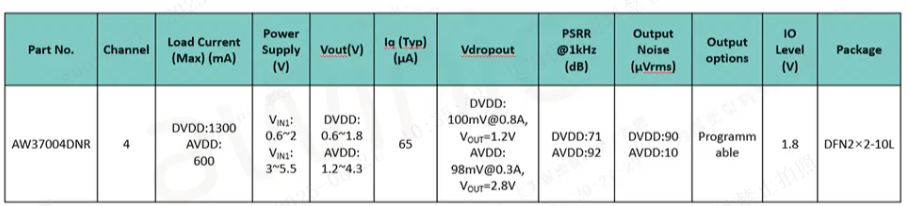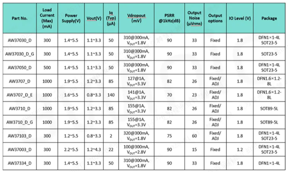 AW37283BXXX-Q1 boasts an extremely low dropout voltage characteristic: when VOUT = 3.3V and IOUT = 300mA, Vdropout = 275mV; when VOUT = 5V and IOUT = 300mA, Vdropout = 260mV. This means it can still maintain a stable output voltage even when the difference between the input voltage and output voltage is very small. This feature enables AW37283BXXX-Q1 to perform excellently in low-dropout applications, maximizing power efficiency and reducing power consumption.