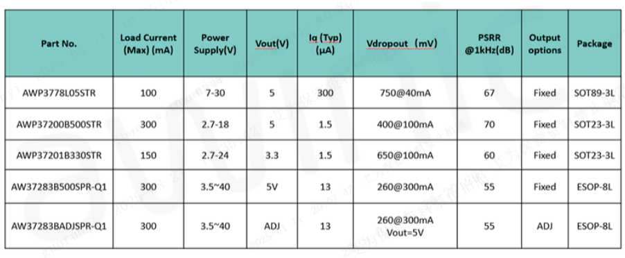 In today’s rapidly developing automotive electronics industry, efficient, stable, and reliable power management solutions are of crucial importance. As automotive electronic systems become increasingly complex, the requirements for power regulators are also rising. AW37283BXXX-Q1, an automotive-grade low-dropout linear regulator (LDO) specifically designed for automotive electronics, features a wide input voltage range, low dropout voltage, ultra-low quiescent current, and multiple protection functions. With its outstanding performance, rich features, and strict automotive-grade certifications, AW37283BXXX-Q1 provides a reliable solution for the automotive electronics field.
