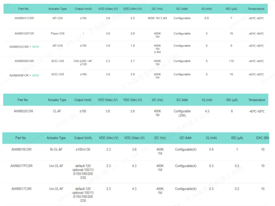 For auto-focus and optical anti-shake applications, Awinic continues to launch a diverse range of products, covering open/closed-loop focus drives, OIS drives, piezoelectric drives, and more. This achieves comprehensive coverage in the field of camera motor drives, and the rich product ecosystem provides customers with more options.