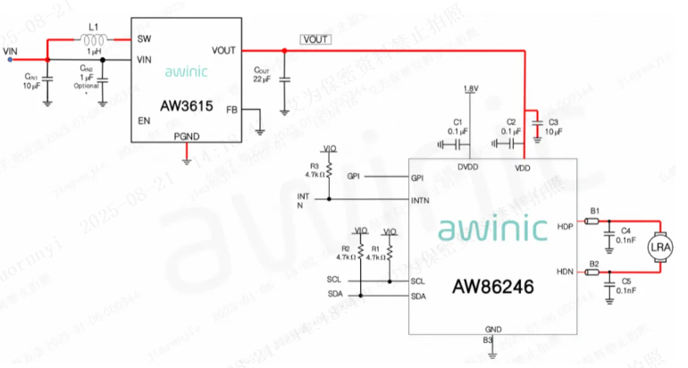 Traditional linear motor driver ICs only support single-power supply, and terminal manufacturers usually choose direct VBAT (battery voltage) supply. The AW86246 offers users two power supply options: it can use an external 5V boost supply – high-voltage supply delivers a better short-vibration experience, and the short-vibration effect does not change as the battery voltage decreases. Alternatively, users can choose direct VBAT supply or LDO (Low-Dropout Regulator) supply based on actual application scenarios.