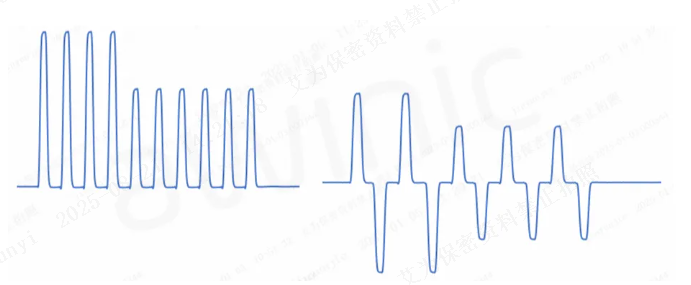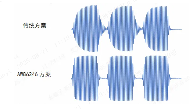 Traditional AAE 1.0 can only perform braking at the end of the waveform, which has significant limitations. However, AAE 2.0, combined with Awinic’s unique control algorithm, enables braking at any time. The AW86246 can detect more motor parameters; when paired with the fast-start function exclusive to Awinic’s Tiktap algorithm, it can perfectly achieve square-wave vibration. The figure below compares the handling of continuous long vibrations between traditional solutions and the AW86246 solution.