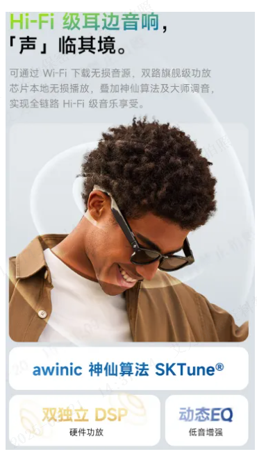 Notably, this compact pair of glasses delivers HI-FI-level audio-visual enjoyment. It adopts Awinic’s AW8816X high-performance DSP digital audio power amplifier to drive two 0920-sized speakers. Combined with the support of Awinic’s "Divine Algorithm" SKTune, it features dynamic EQ enhancement and powerful bass, offering an extremely immersive experience.