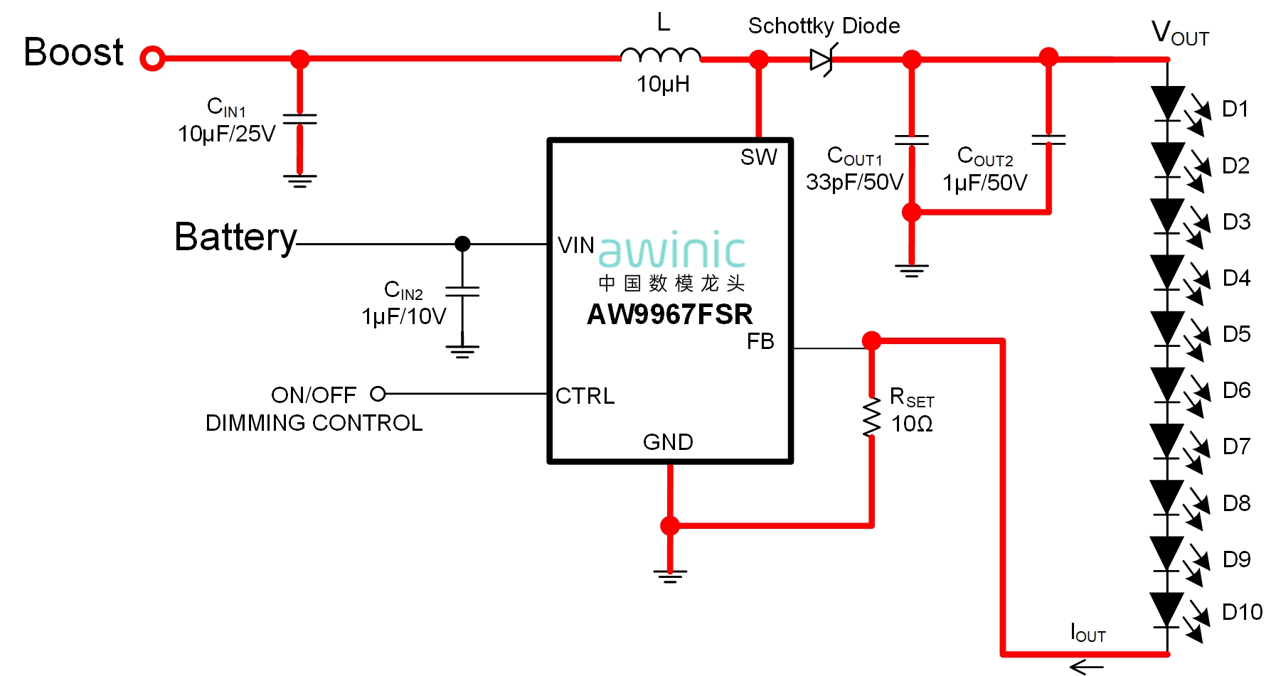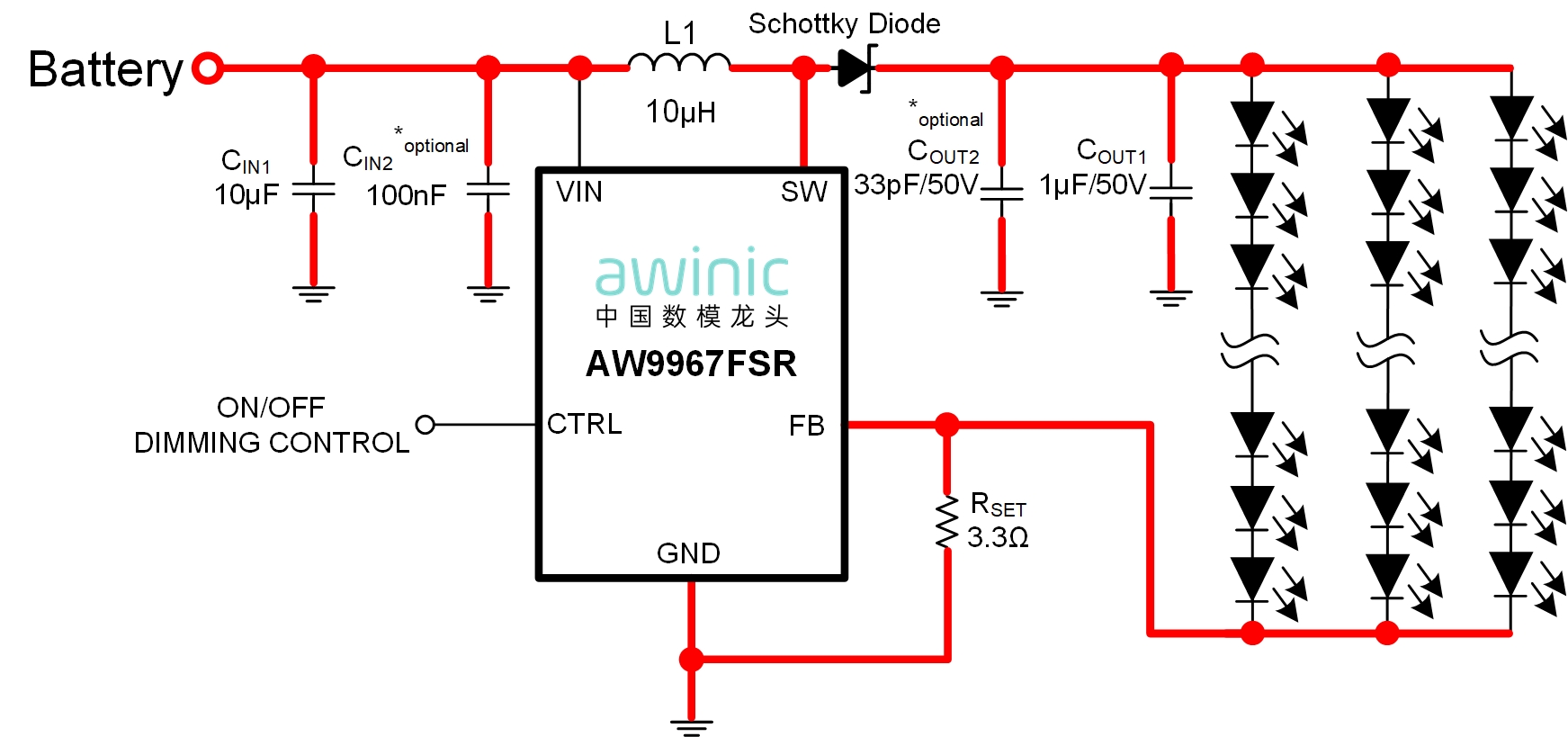 The AW9967FSR is suitable for tablets 12 inches and below. For designs with fewer than 50 LEDs, it supports direct power supply from a single lithium battery. For applications requiring more than 50 LEDs, a boost chip can be used to raise the inductor supply voltage above 5V, thereby achieving higher backlight brightness.