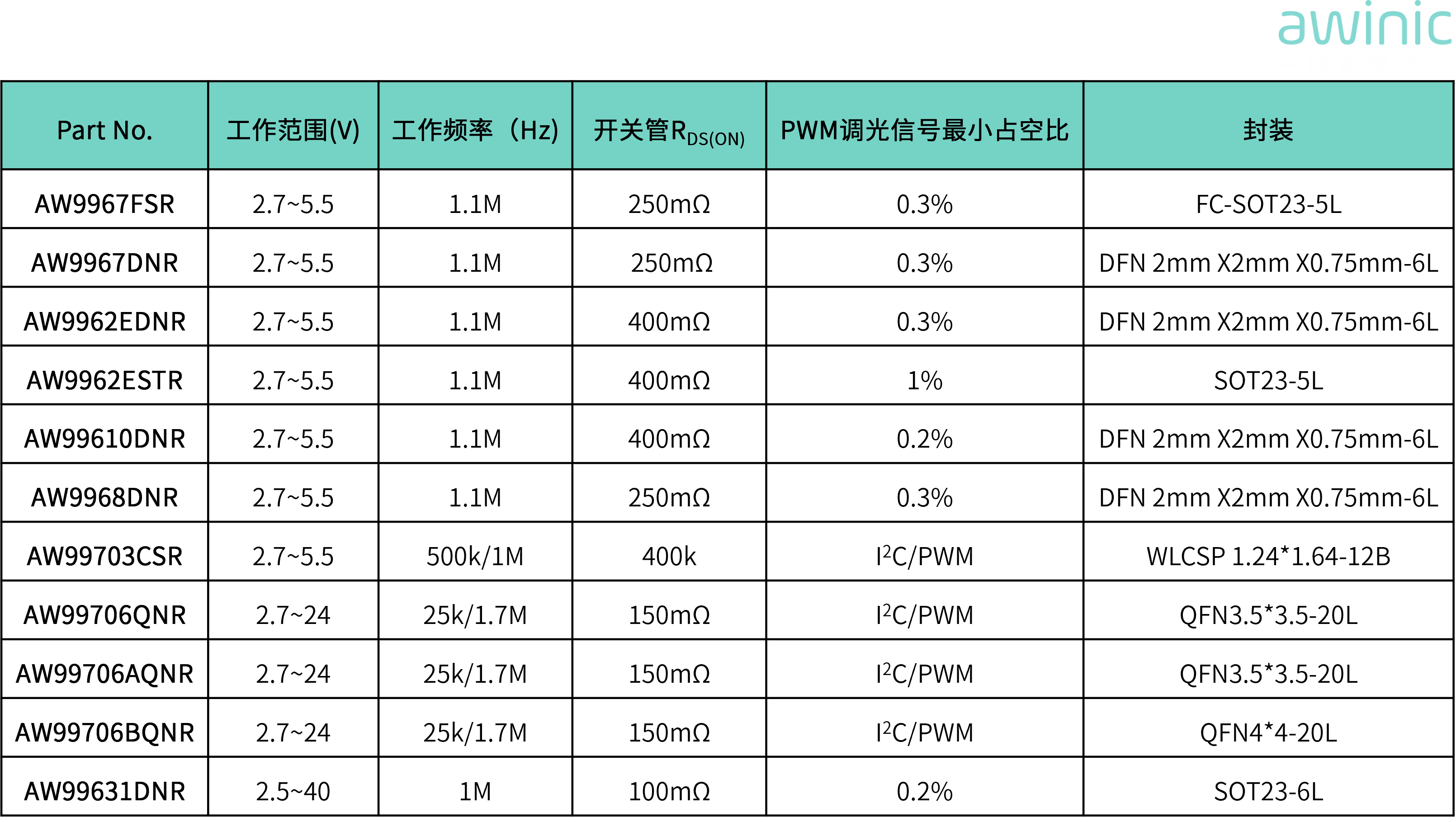 04 AWINIC Series Backlight Product Selection Table