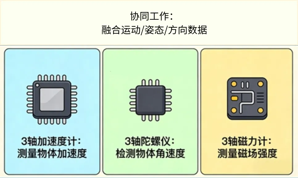 In layman's terms, a 9-axis sensor = a 3-axis accelerometer + a 3-axis gyroscope + a 3-axis magnetometer. These three "partners" each have their own roles, complementing one another to perfectly solve the problem of single sensors being "inaccurate or limited in perception."