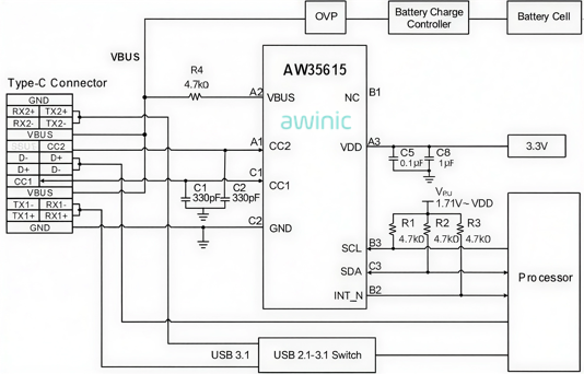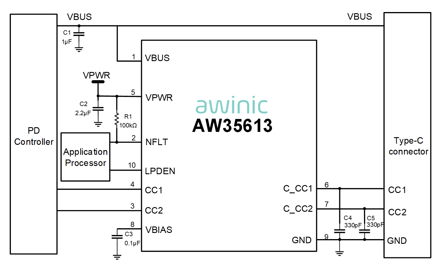 At the same time, this significantly reduces the rate of electrochemical corrosion on the port in toggle mode. When the port voltage changes, the chip's internal monitor logic circuit uses built-in timing logic to detect the equivalent AC impedance or capacitance on the CC pin, thereby distinguishing between normal device insertion and moisture intrusion. Based on this detection, it either opens the MPASS to proceed with subsequent protocol communication or issues an NFLT indication to notify the system of a liquid ingress event. A typical application block diagram for the AW35613 is shown below: