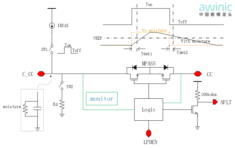 Awinic's PD PHY series chips feature a patent-protected hardware moisture detection circuit integrated into the toggle process. The principle is explained in conjunction with the diagram below: