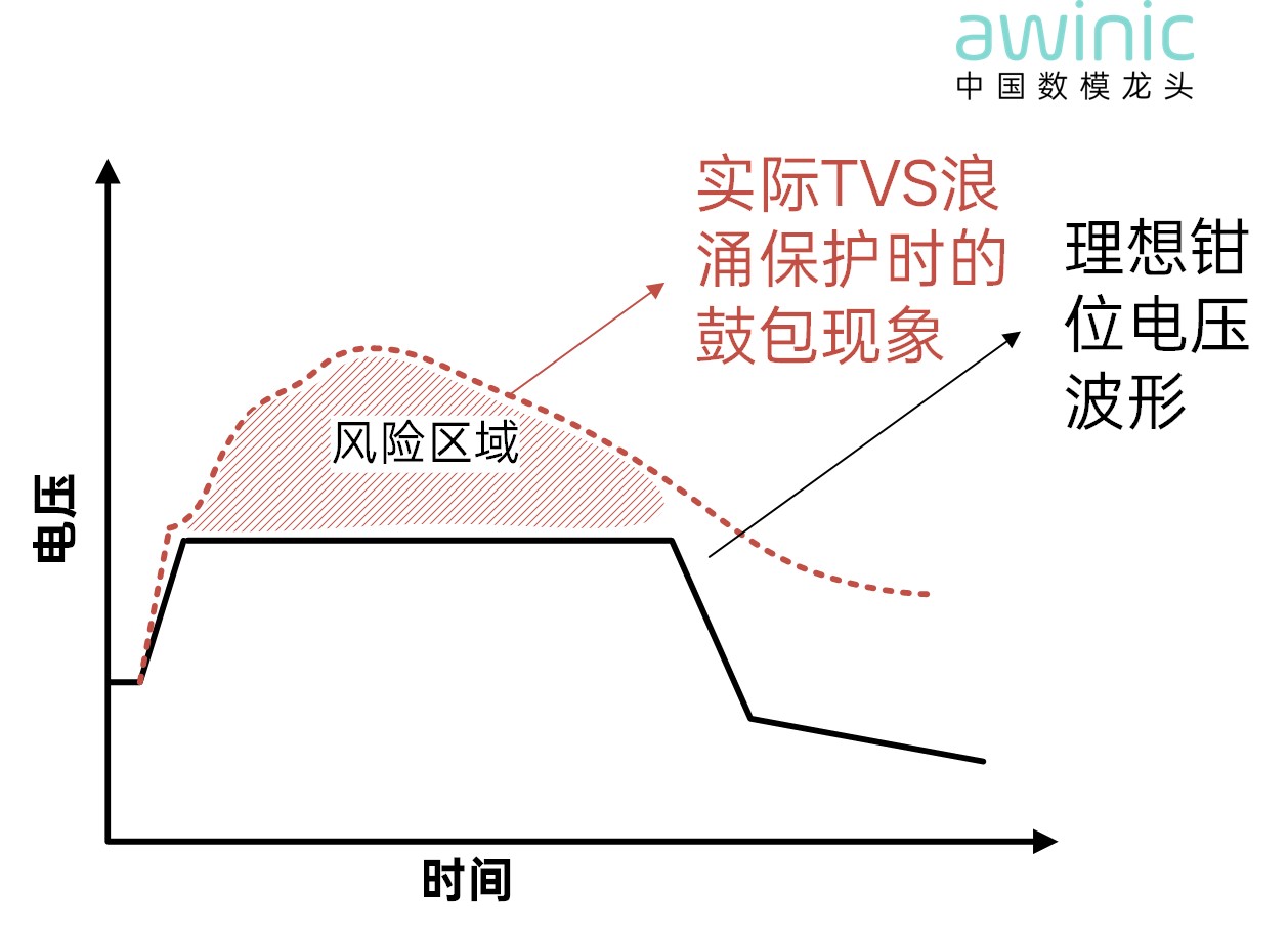 Figure 1: Voltage bulge phenomenon when a traditional TVS triggers surge protection