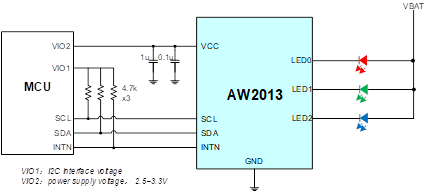 AW2013 drives LEDs with common anode, constant current. The brightness can be modulated in PWM with 256 steps. The output current can be configured in 4 levels: 15mA、10mA、5mA、0mA(default)。