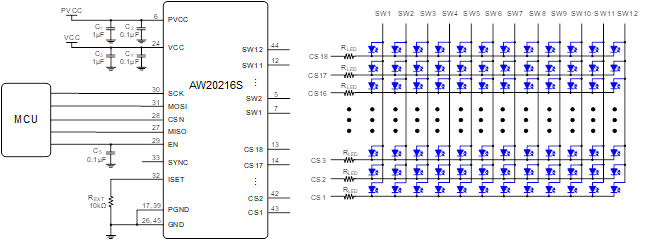 AW20216S is an 18x12 matrix LED driver programmed via an SPI compatible interface. Each channel has individual 8-bit DC current setting for color-mixing and 8-bit PWM current setting for brightness control. The global current of each channel is configured via register GCCR and external resistor REXT.