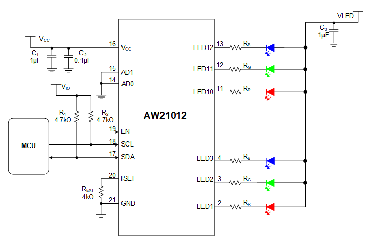 AW21012 is a 12-channel multi-function LED driver. Each channel has individual 8-bit DC current setting for color-mixing and maximum 12-bit PWM resolution for brightness control. The global current of each channel is recommended to be 40mA configured via register and external Resistor REXT.