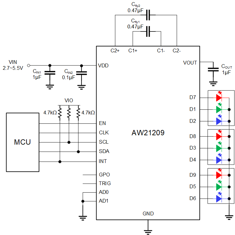 AW21209 features a control interface compatible with the I2C protocol and supports four different address selections, facilitating system integration. The TRIG pin can trigger the operation of light effects and synchronize multiple devices. The INT pin can send an interrupt signal to the processor after the lighting sequence is completed. The GPO pin can be used as a digital control pin for other devices.