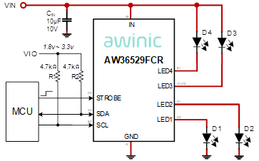 The AW36529 is controlled via an I2C-compatible interface. The main features of the AW36529 include: flash / torch / IR / Indicator current, flash timeout duration, IVFM and breath features. The AW36529 also provides hardware flash pin (STROBE) to control flash event.