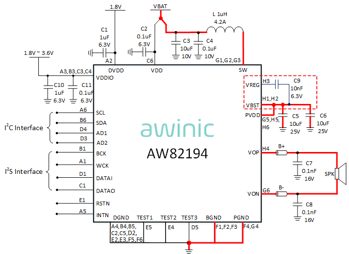 The AW82194 features high RF suppression and eliminates TDD noise completely benefited from the digital audio input interface. General settings are communicated via an I2C-bus interface, and the device address is configurable.