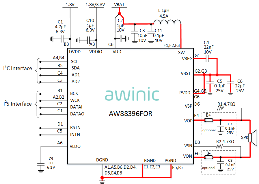 The AW88396FOR features high RF suppression and eliminates TDD noise completely benefited from the digital audio input interface. General settings are communicated via an I2C-bus interface, and the device address is configurable.
