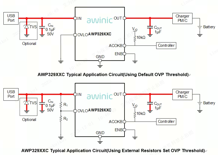 The default OVP threshold is 5.95V (AWP32901C), the OVP threshold can be adjusted from 4V to 24V through external OVLO pin.