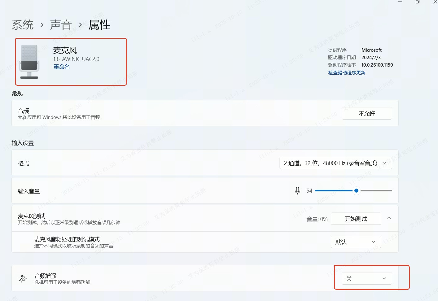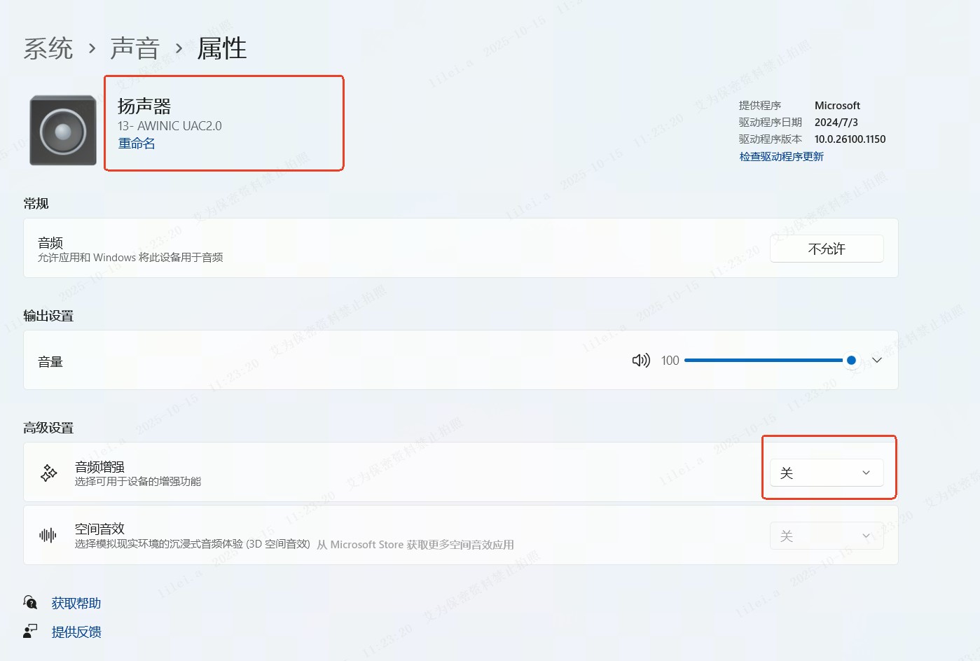A:win11笔记本中自带的音效造成的影响。EVB板接入笔记本时,扬声器和麦克风的音效会默认打开。其中麦克风的音效打开会导致SKTune读取不到EVB板中功放回传的数据。按照下图的设置中关掉扬声器和麦克风的音效可以解决。