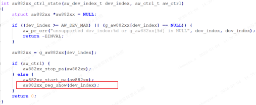 2、在需要打印dump信息的位置添加aw882xx_reg_show/aw883xx_reg_show接口,比如在打开PA后打印dump信息: