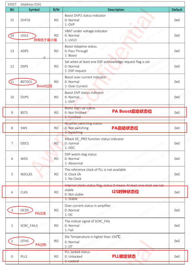 该接口会读取PA状态寄存器(通常是0x01),并检测寄存器中4个关键bit位(bit9、bit8、bit4、bit0),只要任意一个比特位值为0,就会触发该报错。各bit位的具体含义需参考对应型号PA的datasheet中关于0x01状态寄存器的描述,以下以AW88397为例,详细说明各bit位异常的排查方法: