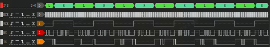 正常线序I2S波形(PA_RX(data in)左右通道均有数据,PA_TX(data out) IV数据通过左声道正常回传,右声道为0):
