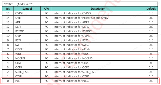该bit位表示PA的BOOST模块是否正常启动,通常不会单独为0,多与bit8(SWS)成对出现异常。若检测到bit4(CLKS)和bit0(PLLS)均为1,但bit8(SWS)和bit9(BSTS)全为0,且未触发其他异常状态位(即0x01寄存器值为0x0011),建议多次抓取0x02中断寄存器的值,查看是否触发CLK和PLL相关中断,0x02寄存器的bit5、bit4和bit0,如下图所示。若触发该中断,说明时钟信号不稳定,需实际量取I2S时钟信号,重点检查时钟信号质量,排除信号干扰、中断、衰减等问题。